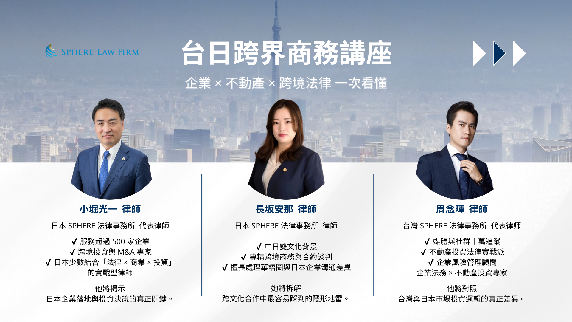 弁護士法人スフィア東京(本社:東京都港区、代表弁護士:小堀光一、以下「当事務所」)は、2026年3月14日(土)、台湾・台北市において「クロスボーダービジネスセミナー(台日投資・商務落地実戦)」を開催いたしました。当日は、日本への不動産投資およびビジネス進出を検討する台湾の経営者・投資家を中心に多数の来場者を迎え、盛況のうちに終了しました。
