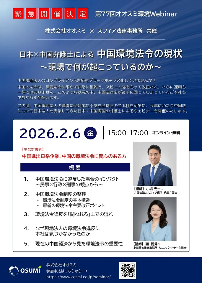 律師法人Sphere東京 (Sphere法律事務所)(總部:東京都港區 代表律師:小堀光一以下簡稱「本所」)於 2026 年 2 月 6 日(週五)與株式會社Osumi (Osumi Co., Ltd.)(總部:神奈川縣橫濱市 代表取締役:大角武志)共同舉辦了「日中律師聯合解析:中國環境法令現狀 —— 現場實務情況大公開」線上研討會。本所代表律師小堀光一以講師身份出席並進行了專題演講。